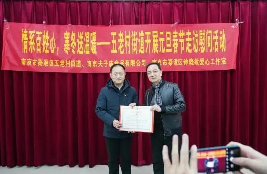 活動(dòng)中,五老村街道黨工委書記李寧松給南京夫子廟食品有限公司頒發(fā)了慈善捐助證書,代表街道感謝愛心企業(yè)的真心善舉、深情厚誼。李寧松說,扶貧幫困是中華民族的光榮傳統(tǒng),脫貧攻堅(jiān)更是一項(xiàng)偉大的工程,需要凝聚全社會(huì)力量才能完成。南京夫子廟食品有限公司不僅帶來了豐富的慰問品,更帶來了對(duì)廣大困難群眾濃濃的關(guān)心,充分體現(xiàn)了愛心企業(yè)積極回報(bào)社會(huì)的責(zé)任感和扶貧幫困、樂善好施的中華傳統(tǒng)美德。